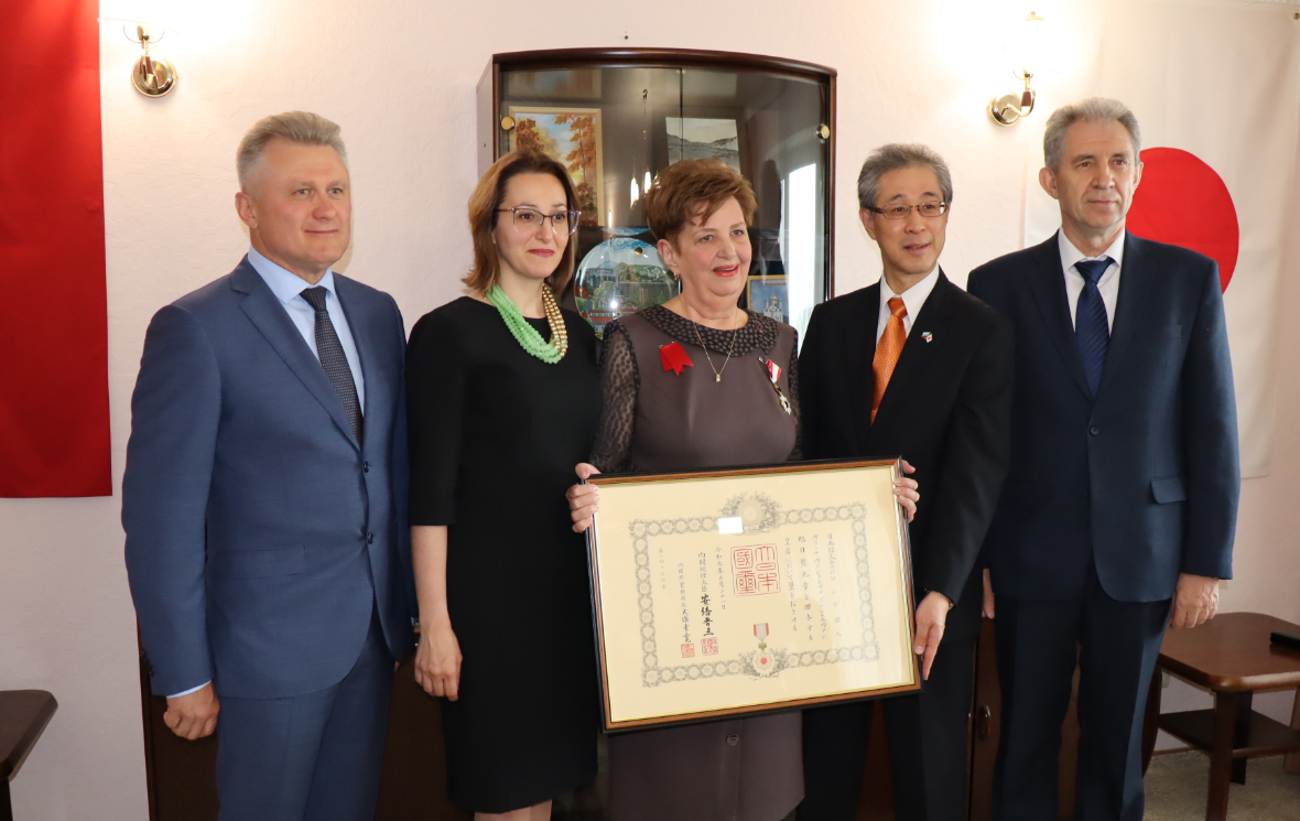 平野隆一在ユジノサハリンスク日本国総領事より,日本・ロシア間の人的交流及び相互理解の促進への寄与の功績を称え,ズラジャエヴァ氏に対し旭日双光章が授与されました。